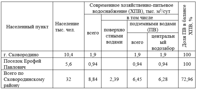 Таблица 2. Общий объем воды питьевого качества на территории Сковородинского района [11]