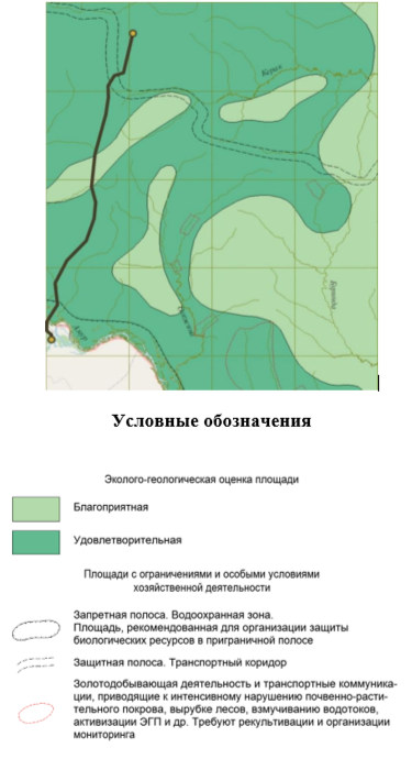 На рисунке 9. приведена схема оценки качества ресурса геологического пространства, согласно которой трасса магистрального нефтепровода «Сковородино-Мохэ» проходит в границах благоприятной и удовлетворительной зоны рассматриваемой территории. Определенные ограничения накладывает лишь наличие транспортного коридора в северной части трассы.