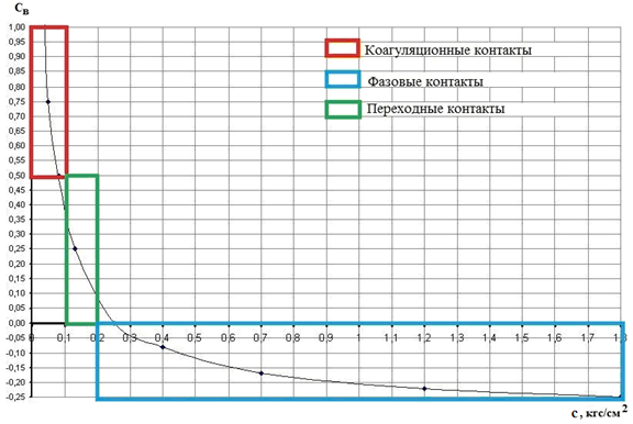 Итак, зная две «критические точки состояния грунтов» (We > WL и We < Wρ), можно построить графики зависимости «удельное сцепление – показатель консистенции грунта естественного сложения» (рис. 1) и получить распределение типов контактов в зависимости от прочности для каждой разновидности глинистого грунта. Подчеркнем, что номограмма, представленная на рисунке 1, построена исходя из ныне существующей градации типов контактов в грунте. Очевидно, что в природных грунтах переходные контакты (в той или иной мере) будут присутствовать при 1,0> CВ> -0,25.