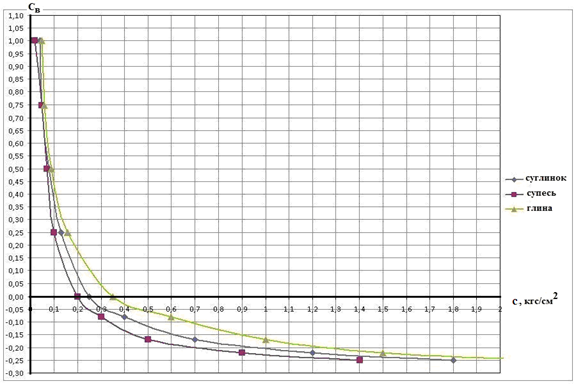Рис. 2. Зависимости «показатель консистенции грунта естественного сложения СВ – удельное сцепление с» для трех разновидностей минеральных глинистых грунтов