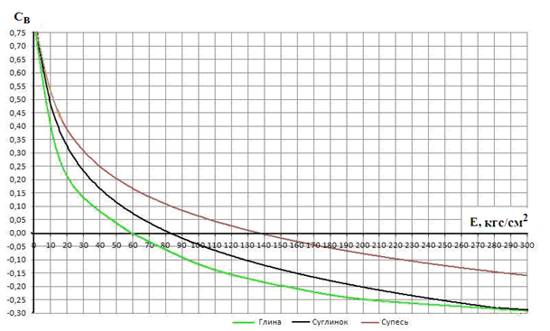 Таким образом, с большой долей достоверности мы можем определить только начало деформации грунта природной консистенции в естественном сложении. Например, для мягкопластичных суглинков модуль деформации Е = 10 кгс/см2 при СВ = 0,5. Исходя из типа микростроения («ближних коагуляционных» контактов по Соколову [21] и «переходных» по сути) меньше он быть априори не может. При приложении же бульшей вертикальной нагрузки (после наступления стабилизации после предыдущей нагрузки) может. Только это будет уже совсем другой показатель, не имеющий отношения к природным характеристикам грунта.