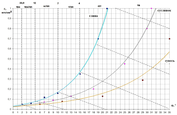 На рисунке 2 представлены зависимости «показатель консистенции грунта естественного сложения – удельное сцепление» применительно к конкретным грунтам. Из рисунка видно, что переход через вторую критическую точку грунта (We < Wρ) у разных разновидностей глинистых грунтов различен: у супеси удельное сцепление в этой точке составляет 0,20 кгс/см2, у суглинков – 0,25 кгс/см2. По результатам лабораторных определений построены только графики для суглинков и супесей. В силу того, что классические глины на территории Санкт-Петербурга практически отсутствуют, график для глин, показанный на рисунке 2, носит теоретический характер и должен будет быть подтвержден экспериментальными исследованиями. Пока, по всей видимости, стоит ожидать, что сцепление глин будет лежать в диапазоне 0,25-0,30 кгс/см2. Вполне вероятно, что данные значения соответствуют минимальной начальной прочности фазовых контактов в грунте.