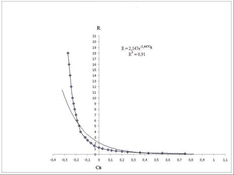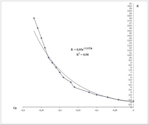 Рис. 1. График зависимости «консистенция грунтов естественного сложения (Св) – удельное сопротивление пенетрации (R)» для минеральных глинистых грунтов с коагуляционными и переходными контактами