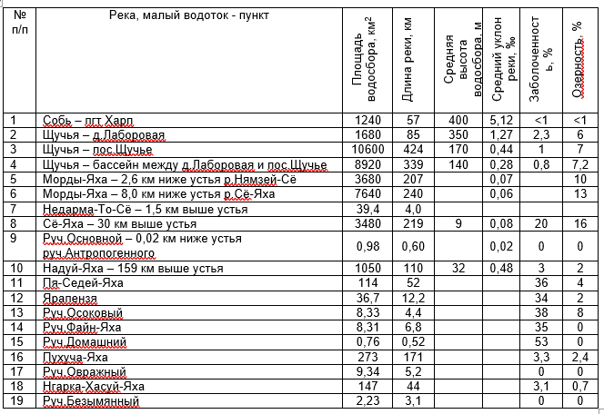 Таблица 1. Гидрографические характеристики водосборов исследованных рек и малых водотоков
