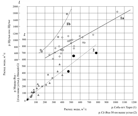Рис. 3. Графики связи расходов воды весенне-летнего половодья между ГП. Обозначения: 1 – максимальные расходы воды р. Щучья — пос. Щучье и р. Собь — пгт Харп: а — в годы со сходными в бассейнах условиями формирования расходов (R = 0,86), b — в годы с дружным половодьем на р. Щучья — пос. Щучье и недружным половодьем на р. Собь — пгт Харп (R = 0,98); 2 – среднедекадные, среднемесячные и максимальные расходы воды р. Морды-Яха — 2,6 км ниже устья р. Нямзей-Сё и р. Сё-Яха — 30 км выше устья (R = 0,98). На линии связи (2) кружками показаны максимальные значения, крестиками – средние за месяц, треугольниками – средние за декаду