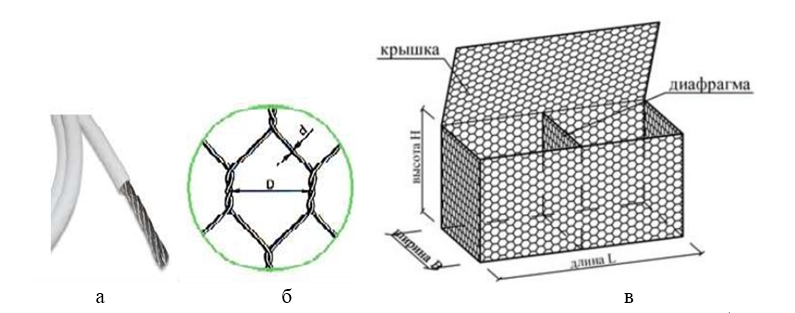 Рис. 2. Оцинкованная проволока двойного кручения для создания плетеных оболочек габионов (а); ячейка плетеной сетки для габиона из такой проволоки (б) и контейнер для прямоугольного коробчатого габиона с армирующей перегородкой, изготовленный из плетеной сетки, прикрепленной к жесткому каркасу (в) [1, 16]