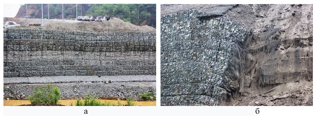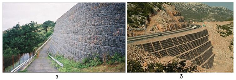 Рис. 6. Подпорная стенка из коробчатых габионов на крутом склоне для защиты пешеходной дорожки (а) и укрепленный коробчатыми габионами горный склон для поддержки автомобильной дороги (б) [1, 13]