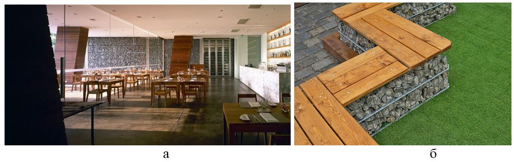 Рис. 13. Использование коробчатых габионов для декорирования помещений (а) и создания садовой мебели (б) [11, 12]