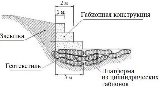 Рис. 14. Пример использования цилиндрических габионов в качестве основания для подпорной стенки из коробчатых габионов [1]