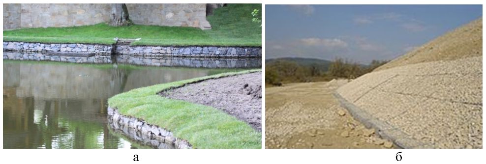 Рис. 15. Примеры использования матрасно-тюфячных габионов для выстилки пологих берегов пруда (а) и горной реки (б) [1, 13]