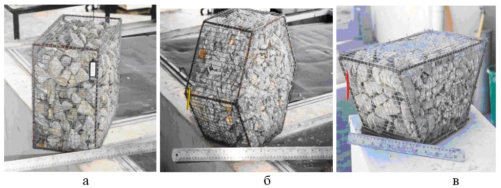 Поскольку стенки из габионов, по сути, являются гравитационными сооружениями, увеличить их сопротивление горизонтальным воздействиям можно путем значительного увеличения их массы, что может оказаться экономически невыгодным или даже недостижимым из-за проблем с установкой блоков. Поэтому М. Рамли с соавторами [17] и решили изучить возможность применения габионов той же массы, но другой формы. Они предложили использовать блоки в виде шестиугольных призм и их взаимоблокирующую (взаимозамыкающую) укладку в виде пчелиных сот с созданием сплошной защитной стенки (рис. 21). В нижнем и в верхнем ряду такой стенки понадобились также и полугексагональные блоки (рис. 22, в). Отметим, что ранее этот метод (метод Йорка), использовался только для облицовки бетонных стен [14].