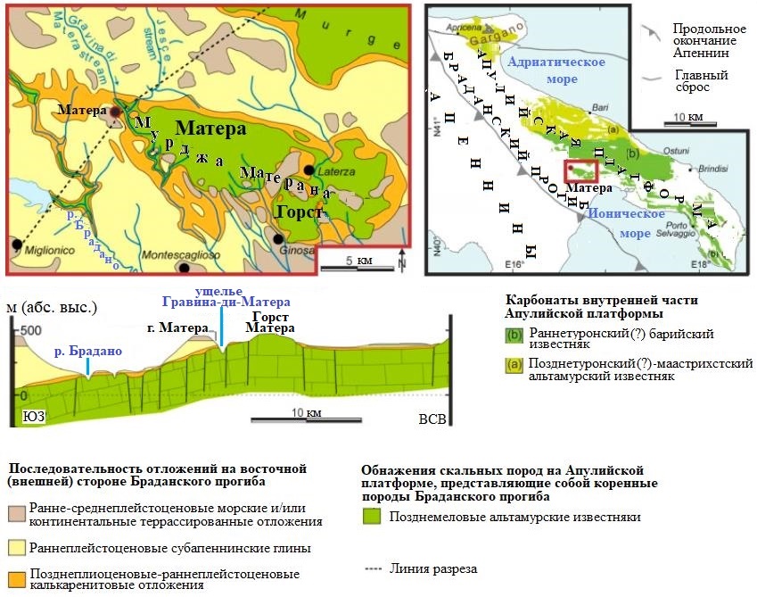С геологической точки зрения территория городского района Матеры попадает в контекст возрастного и структурного перехода между прибрежной полосой Апулийской карбонатной платформы и Браданского молассового прогиба (по названию реки Брадано). Город Матера появился на восточном краю вышеуказанного прогиба, возникшего в среднем плиоцене в мезозойских альтамурских известняках и характеризующегося наличием двух поднятий, образовавшихся при тектонических движениях, – одного в юго-западной части города, называемого горстом Загарелла [13, 14], и второго в юго-восточной части, называемого горстом Матера (рис. 2). На известняковом субстрате осели калькаренитовые отложения, потом мелкодисперсные обломочные материалы, представленные плейстоценовыми морскими глинами, а затем песчаные и террасированные конгломератные отложения, замыкающие плиоценово-плейстоценовый осадочный цикл. Морфология этой территории, характеризующаяся глубокими узкими ущельями (теснинами) и голыми горными плато, в которые интегрировано множество древних пещерных церквей, пастушьих троп с колодцами вдоль них и укрепленных жилых помещений, образует один из самых ярких ландшафтов Средиземноморья [15].