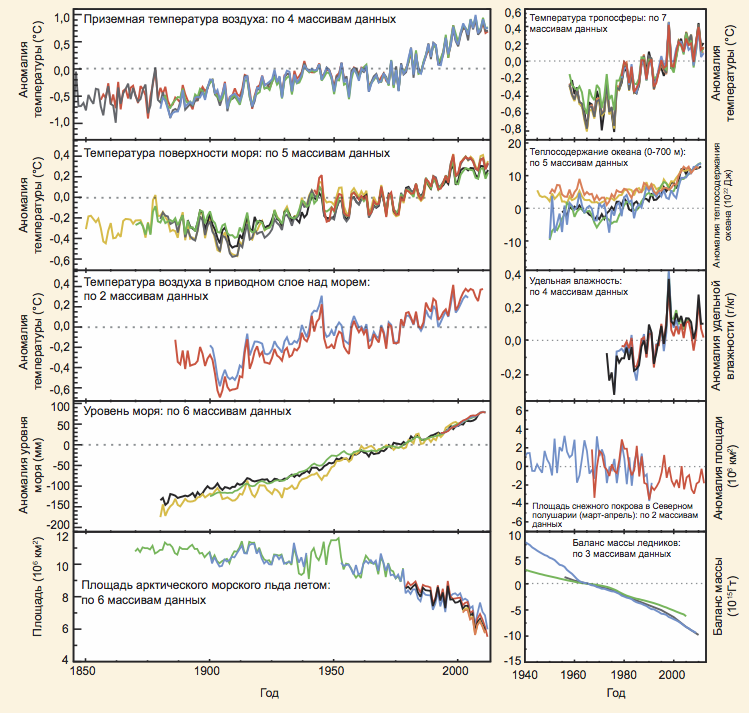 Анализ данных наблюдений со спутников, в атмосфере, в толще воды, по всей поверхности Земли (суши, Мирового океана, льда, снега), в скважинах, полученных с использованием самых разных методов, а также результаты численного моделирования доказали, что в последние 100–150 лет происходят глобальные изменения климата, слишком быстрые по крайней мере для последних 0,8–3 млн лет (в сотни или тысячи раз быстрее). Они касаются роста температуры в приземном воздухе, в тропосфере (при понижении температуры в нижней стратосфере), увеличения температуры воды в приповерхностных слоях Мирового океана, изменения характеристик его теплых течений (Гольфстрима, Эль-Ниньо), повышения уровня моря примерно на 3 мм в год, сокращения массы и площади ледников и морских льдов, деградации многолетней мерзлоты, роста удельной влажности воздуха, увеличения количества атмосферных осадков и др. (рис. 1).