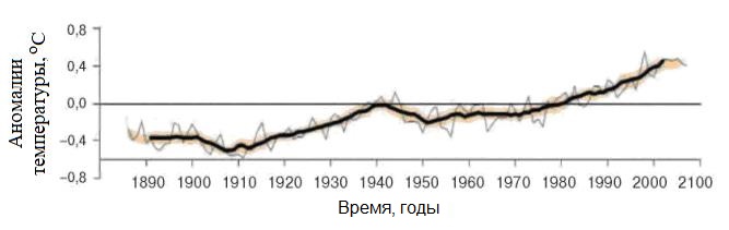 Рис. 2. Изменения среднегодовой температуры приземного воздуха начиная с конца XIX века, осредненные по земному шару (серая кривая). Жирная черная линия показывает сглаженный ход температуры (11-летние скользящие средние). Затененная коричневатая область обозначает границы 95%-ного доверительного интервала для 11-летних средних [6]