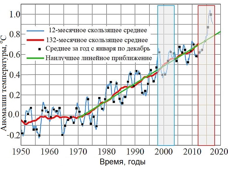 Рис. 3. Глобальные аномалии приповерхностной температуры воздуха начиная с 1950 года [50]