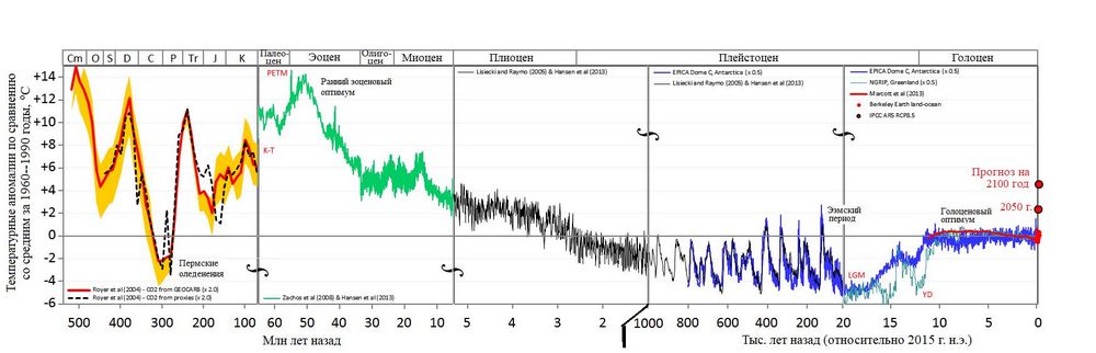 Рис. 6. Изменения глобальной температуры приповерхностного воздуха на Земле за последние 550 млн лет [49]