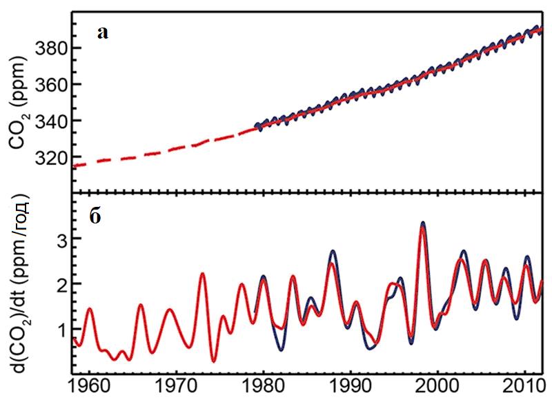 Рис. 8. Глобальные изменения содержания углекислого газа в атмосфере: а – красной линией показаны измеренные концентрации углекислого газа, осредненные по годам, в частях на миллион частей воздуха (ppm), cиней линией показаны данные еженедельных спутниковых измерений, а ее колебания скорее всего отражают сезонные изменения активности северных лесов; б – скорость изменений содержания углекислого газа [49]