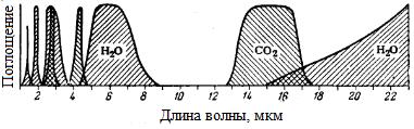 Рис. 10. Основные области поглощения инфракрасных лучей углекислым нгазом и водяным паром [44]