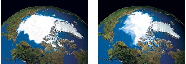 Рис. 1. Области, покрытые арктическим льдом, в зимние периоды 1979 г. (слева) и 2003 г. (справа). Космические снимки сделаны в одно и то же время года [56]