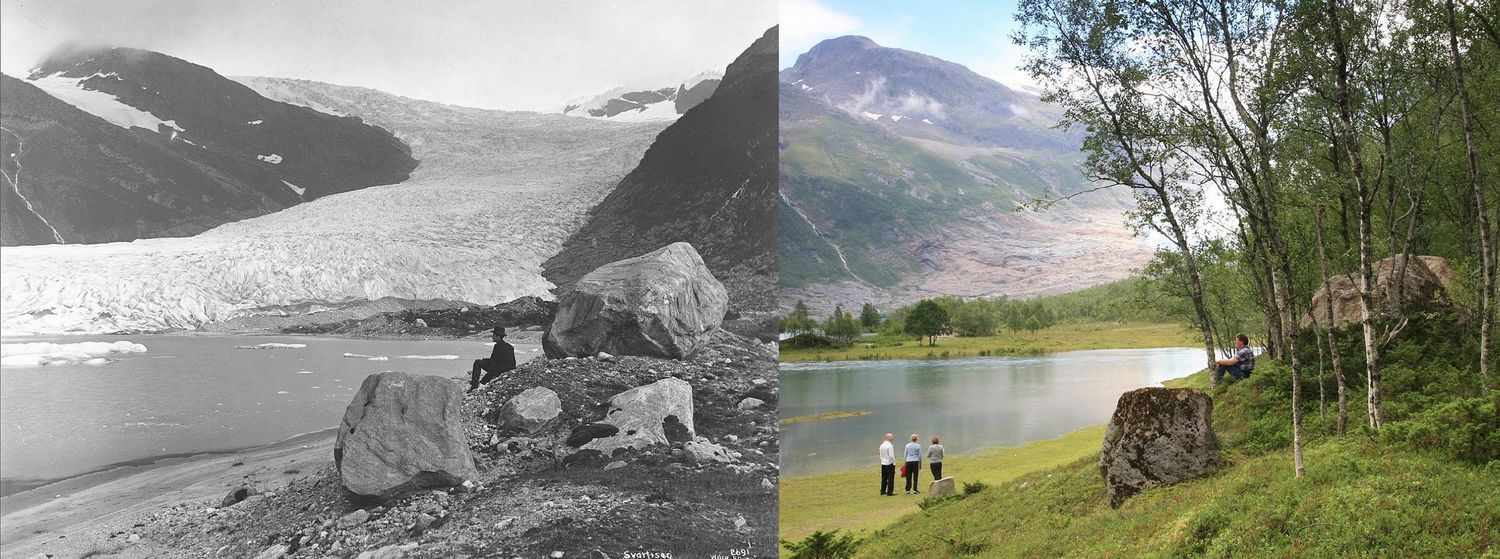 Рис. 2. Ледник Энгабреен в Северной Норвегии в 1889 г. (слева) и в 2010 г. (справа). Фотографии сделаны из одной и той же точки в одно и то же время года [74]