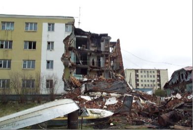 Рис. 5. Cекция здания в поселке Черский, обрушившаяся в результате ослабления фундамента при растеплении его многолетнемерзлого основания [2]