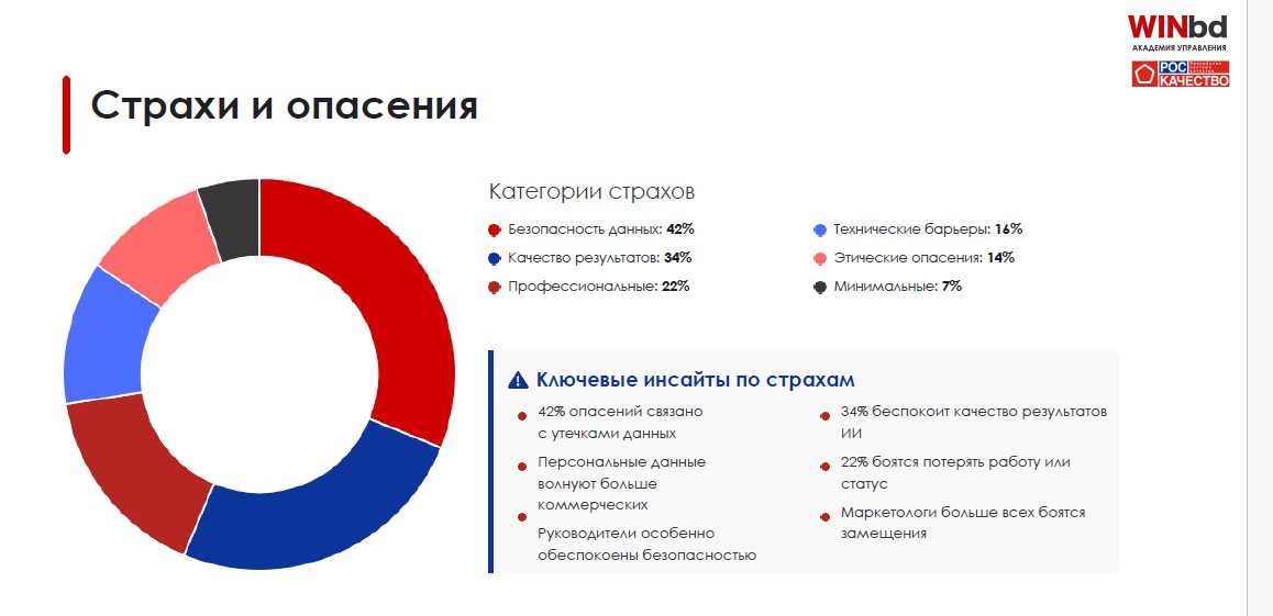 Страхи присущи как активным пользователям, так и тем, кто к ИИ и не подступался. 42% опасений связано с утечками данных. 34% опрошенных сомневаются в качестве результатов. Пятая часть сотрудников боится потерять работу или статус.