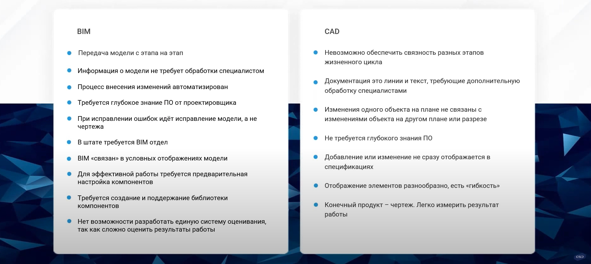 Продолжил вебинар Егор Сидельников, технический специалист TBS software. Он рассказывал непосредственно о проектировании искусственных сооружений в Revit. Однако в начале своего выступления он все же остановился на очень интересном вопросе – обоснованном сравнении BIM и CAD.