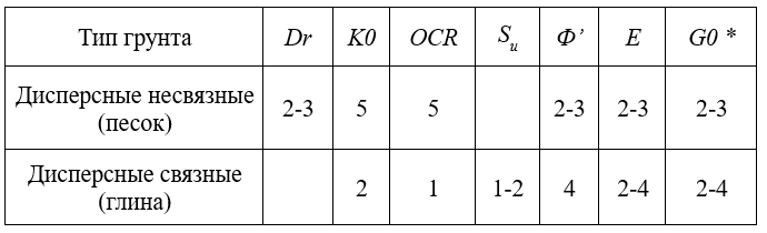 Таблица 1. Неопределенность параметров, получаемых при интерпретации данных статического зондирования