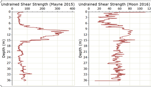 Рис. 1. Результаты определения недренированной прочности на основе результатов испытаний статическим зондированием по методике Муна (Moon, 2016), Мейна (Mayne, 2015)