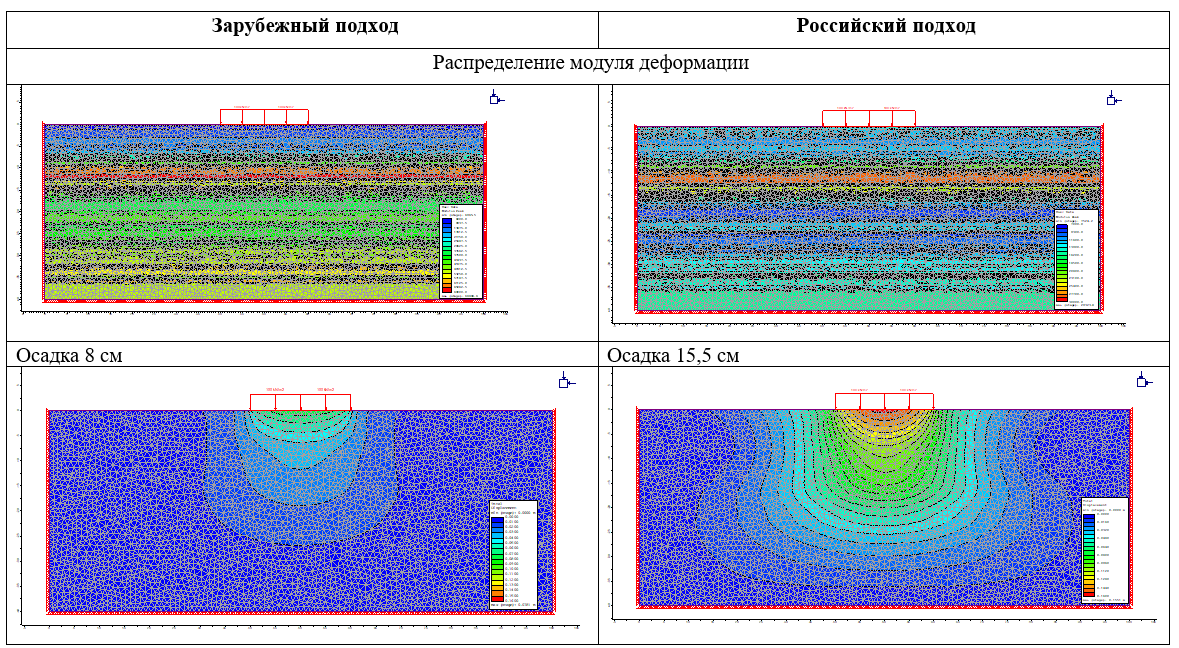 О последствиях в различии результатов определения значений модуля деформации по результатам статического зондирования можно судить по результатам расчета осадки, использовав одни и те же данные статистического зондирования, проинтерпретированные по двум методикам: по российской и зарубежной (рис. 4). Как можно заметить, разница в значениях осадки различается практически в два раза (15,5 см и 8 см). Это говорит о том, что интерпретация данных статистического зондирования очень неоднозначная тема, к которой следует приступать с осторожностью для получения максимально приближенных к реальности данных.