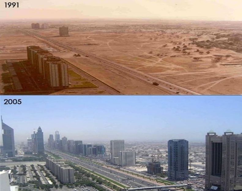Рис.1. Впечатляющая картина изменения ландшафта при создании современного города в пустыне Аравийского полуострова (Дубай). Каждый кустик растительности здесь требует полива пресной водой, а общественное пространство кондиционирования воздуха