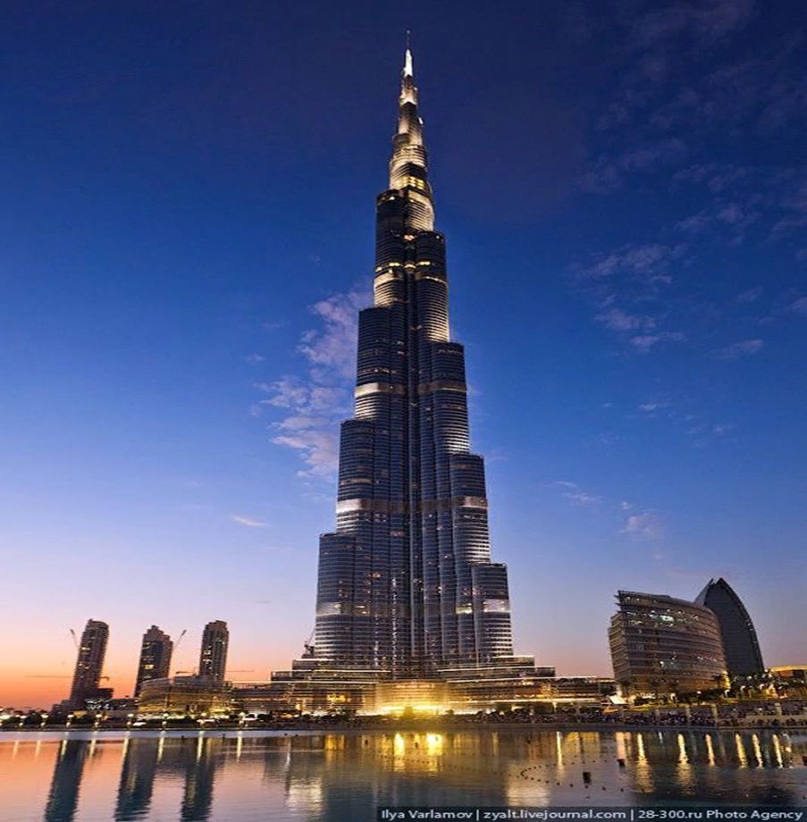 Рис. 4. Вид на башню Бурдж Халифа высотой 828 м (электроэнергией башня обеспечивается ветровой турбиной и солнечными панелями общей площадью 15 тыс. кв. м, кроме того, здание оснащено специальной защитой от солнца и отражающими стеклянными панелями, которые уменьшают нагрев помещений внутри, что минимизирует необходимость в кондиционировании). Для строительства были разработаны специальные марки бетона, заливка которого осуществлялась в ночное время с добавками льда.