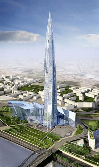 Рис. 1. Многофункциональный высотный комплекс Лахта Центр. Высота – 462 м, Площадь – 5550 кв.м, нормативная нагрузка от Башни – 501 000 т, расчетная нагрузка от Башни – 672 000 т, максимальная глубина изысканий – 150 м