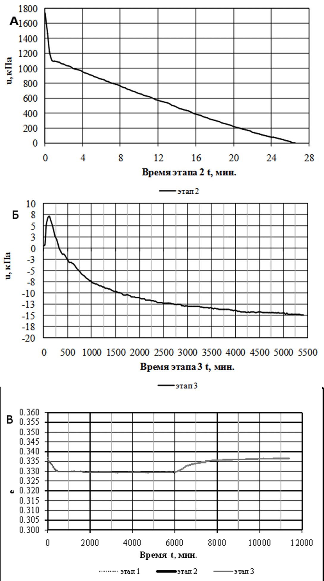 Рис. 5. Моделирование процесса отделения образца от массива, подъема на поверхность и хранения. А — График изменения порового давления на этапе отделения образца от массива грунта и подъема на поверхность; Б — График изменения порового давления в процессе хранения во времени; В — График зависимости изменения пористости образца от времени.