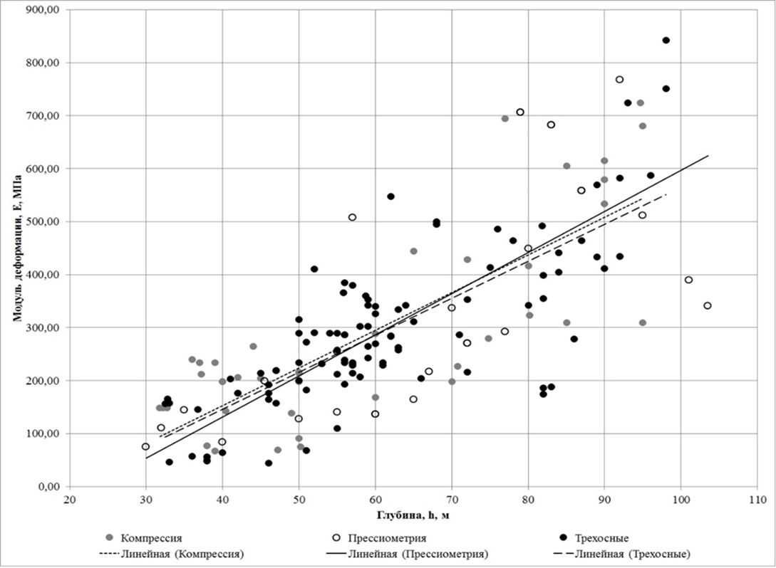 На рис. 10 представлены графики изменения модуля деформации с глубиной, построенные для трехосных и компрессионных испытаний с учетом корректирующих коэффициентов — 1.37 и 3,1 соответственно.