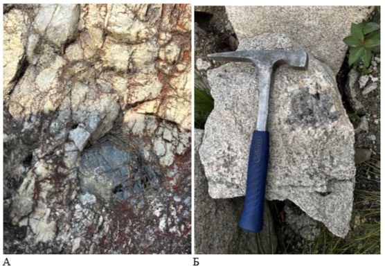 В геологическом отношении рассматриваемая территория располагается в пределах Ангаро-Витимского гранитоидного ареал-плутона [2, 3, 7], сложенного породами каменноугольного возраста – гранитами биотитовыми (рис. 2а), светло-серыми, розовыми, от мелко- до крупнокристаллических, часто порфировидными (рис. 2б).