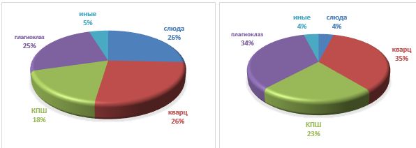 Рис. 3. Минеральный состав двух разностей гранитов (рентгенодифракционный количественный анализ выполнен В.Л. Косоруковым)