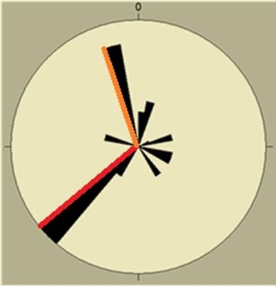 Рис. 4. Диаграмма трещиноватости по азимутам падения основных систем трещин с соответствующими им Перевальным (красный) и Ангараканским (оранжевый) разломами