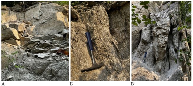 4) граниты сильно выветрелые (рис. 5в), осложненные милонитами и катаклазитами, с гнездами каолина, ожелезнения, с пестрой текстурой;