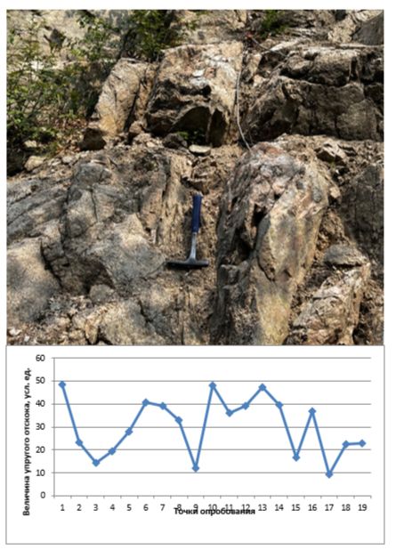 Для приближенной количественной характеристики изменения прочности пород в выветрелых зонах разрывных нарушений (рис. 6а) был использован метод неразрушающего контроля — склерометр (молоток Шмидта), который позволяет на основании полученных показаний отскока по цифровой шкале склерометра и графиков корреляции определить прочность пород в массиве. Опробование проводилось перпендикулярно простиранию зон разрывных нарушений. В линейных зонах выветривания было выявлено (рис. 6б) значительное падение значений упругого отскока, что указывает на снижение показателей прочности.