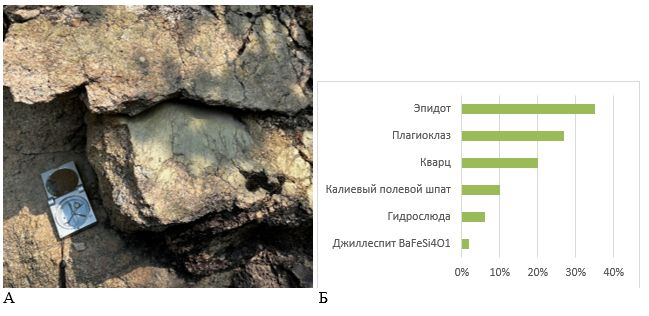 Крутопадающие трещины имеют зеленовато-серый заполнитель, плотный, с явными зеркалами скольжения, не царапается ножом (твердость 6-7). Проведенный рентгенодифракционный количественный анализ (выполнен В.Л. Косоруковым) показал следующий минеральный состав: эпидот – 35%, плагиоклаз – 27%, кварц – 20%, калиевый полевой шпат – 10%, гидрослюда – 6% и др. Вероятнее всего за счет движения флюида по трещинам произошел процесс замещения минералами группы эпидота кальцийсодержащих породообразующих минералов — в нашем случае плагиоклаза.