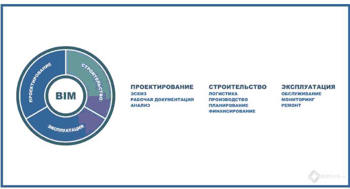 Рис. 1. BIM – процесс трехмерного информационного моделирования объекта строительства на всех стадиях развития проекта [3]. Сюда же можно было бы добавить инженерные изыскание на стадии проектирования, а также снос объекта по окончании срока его службы и рекультивацию площадки