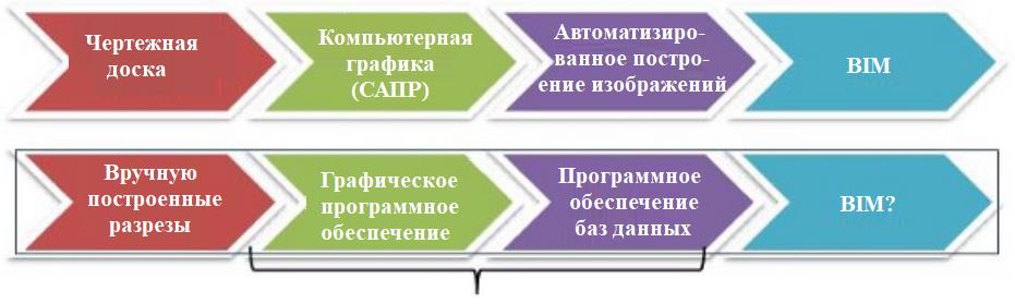 Автор статьи [6] отмечает, что технология 3D BIM является результатом эволюции традиционных методов проектирования (сначала с помощью чертежных досок и кульманов, а затем с использованием все более совершенных систем автоматизированного проектирования – САПР). На рисунке 2 он сопоставляет это с эволюцией программного обеспечения в геотехнической отрасли: первоначально колонки буровых скважин и геологические разрезы рисовались вручную, затем было разработано графическое программное обеспечение, помогающее их строить, а со временем к этой функции добавилось и управление данными, позволяющее распечатывать их одним нажатием кнопки.