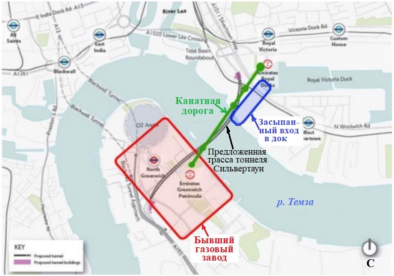 В районе будущего строительства имеется множество сложных проблем (рис. 5). Трасса тоннеля должна будет проходить через промышленно развитые районы Лондона – участки с самыми разными грунтовыми условиями, дорогами, фундаментами и другими подземными сооружениями. Например, южный портал тоннеля должен появиться на территории снесенного газового завода. Но там до сих пор сохранились остатки подземных фундаментов заводских зданий и загрязненные грунты. А на южном и северном берегах Темзы предполагаемая трасса тоннеля проходит близко к пилонным фундаментам канатной дороги Эмирейтс Эйр Лайн (Emirates Air Line). Кроме того, портал тоннеля на северном берегу должен быть построен в районе ныне засыпанного западного входа в Королевский Док Виктории (Royal Victoria Dock) и остатков фундаментов нескольких снесенных пакгаузов (складов).