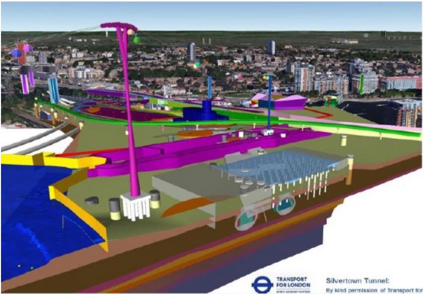 В статье Морина [6] рассказывается о том, как основные принципы BIM по обмену данными и совместной работе в процессе разработки и реализации проекта могут быть использованы для геотехнического строительства на примере лондонского автодорожного тоннеля Сильвертаун (Silvertown Road Tunnel), контракт на строительство которого был заключен в ноябре 2019 года, а ввод в эксплуатацию намечен на 2025 год. Информационное моделирование при инженерных изысканиях и проектировании этого объекта проводилось (и продолжает проводиться) с использованием системы автоматизированного проектирования AutoCAD Civil 3D (рабочие процессы в которой основаны на технологии BIM) и программного комплекса Navisworks (предназначенного для управления BIM-проектами), а также баз данных и систем управления данными (служащих для объединения доступных материалов из разных источников).