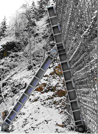 В месте испытаний было установлено 4 лямбда-образные опорные конструкции (см. рис. 2, 3) с шагом 4 м. В результате общая длина барьера Snowcatcher получилась равной 12 м. Высота основной опорной балки опорной конструкции, через которую проходят несущие сеть тросы, равна 5,3 м. Угол наклона этой балки к поверхности земли составляет 85 град. при крутизне склона 25 град. В отличие от других используемых в настоящее время сетчатых сооружений, опорные конструкции барьера Snowcatcher не имеют оттяжек, идущих вверх по склону (имеются только боковые оттяжки), что позволяет убирать лавинные отложения, задержанные барьером, с помощью машин.