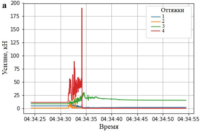 Рис. 5. Результаты измерения усилий в конструкциях барьера Snowcatcher при взаимодействии со снежно-пылевой лавиной, сошедшей 13 января 2019 года: а – силы натяжения в боковых оттяжках; б – силы сжатия в основаниях подкосов лямбда-образных опорных конструкций [4]
