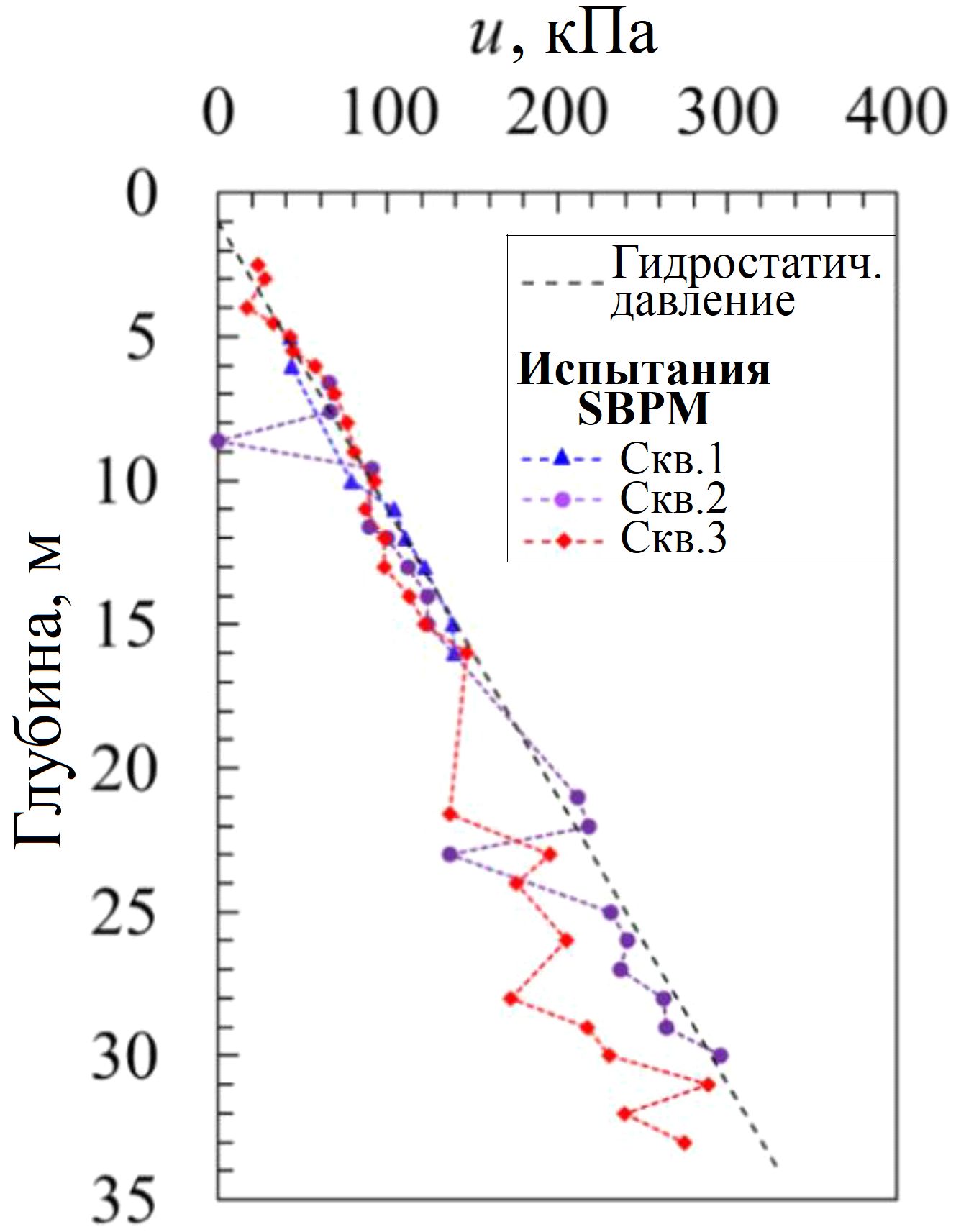 Рис. 7. Результаты определения порового давления воды с помощью испытаний самозабуривающимся пресиометром в скважинах 1, 2 и 3, сопоставленные с гидростатическим давлением