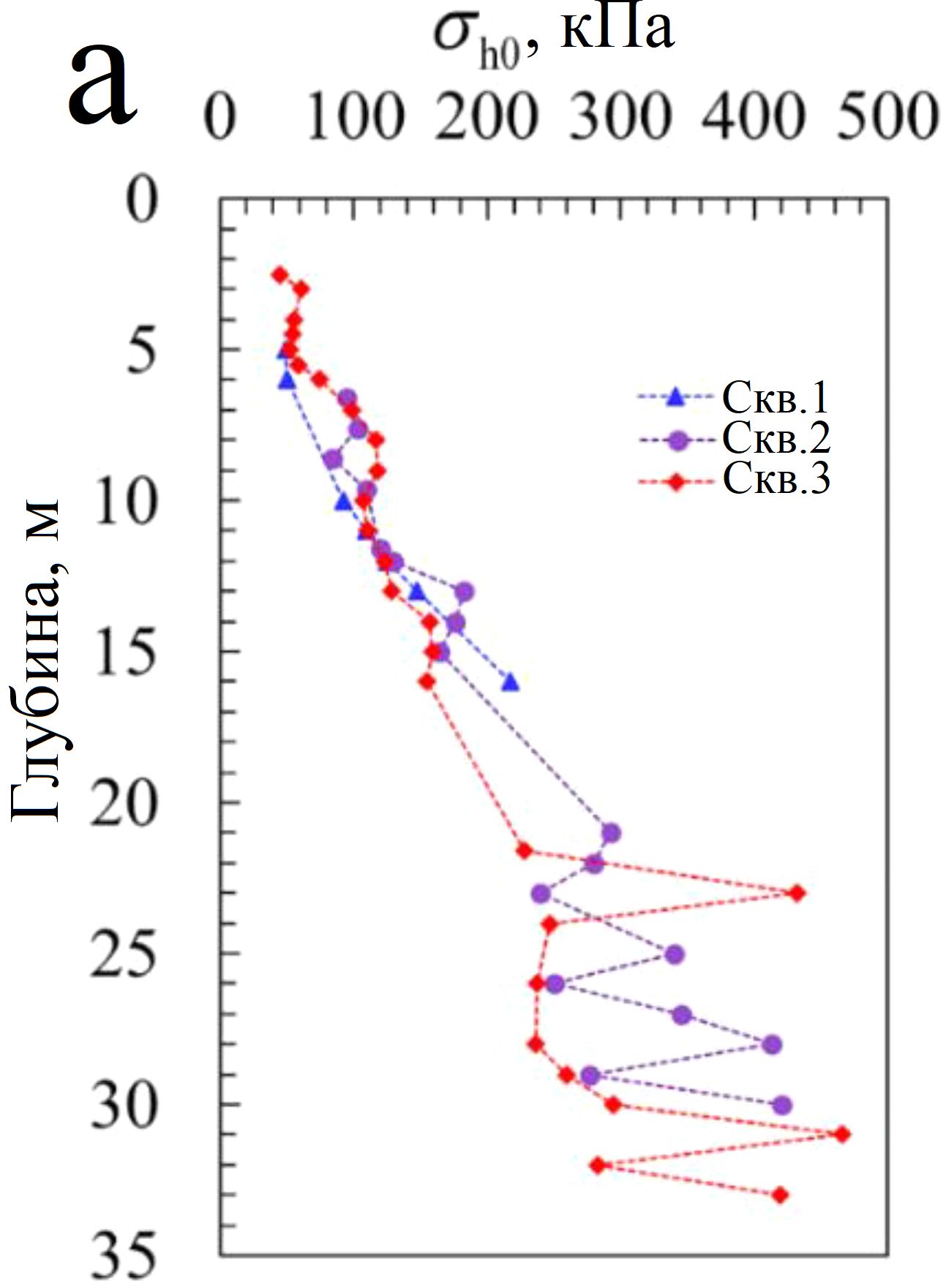 Одной из основных задач испытаний самозабуривающимся прессиометром является измерение горизонтального напряжения in situ. Если принять, что во время введения зонда SBPM не возникает нарушений окружающего грунта, то при достижении прессиометром определенной глубины давление, действующее на мембрану его рабочей камеры, равно горизонтальному давлению in situ (σh0). На рисунке 8, a представлены полученные значения σh0. Видна тенденция к их увеличению с глубиной. Стоит отметить, что нет существенной разницы между данными для трех скважин при глубине менее 17 м, но имеются явные различия между ними при глубине более 17 м.