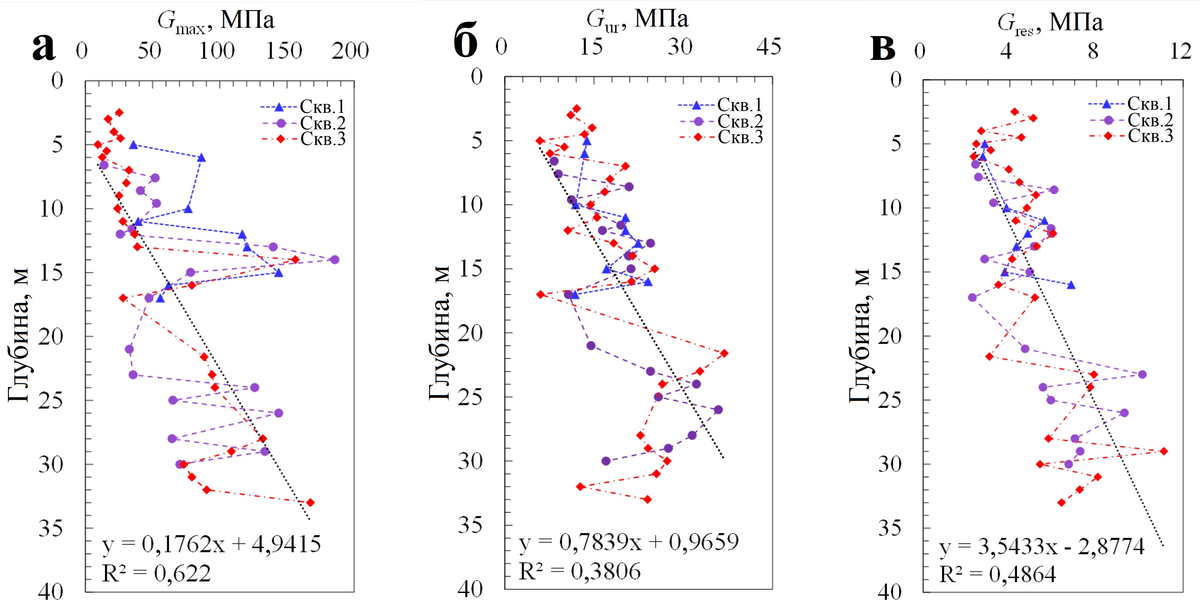 На рисунке 10 видна общая тенденция к увеличению модуля сдвига с глубиной. Значения Gmax находятся в пределах 9,3–185,6 МПа, Gres – в диапазоне 2,8–12,0 МПа. А величины Gur попадают в пределы 6,0–46,9 МПа, что в целом находится между диапазонами Gmax и Gres. Также, видя тенденцию к увеличению с глубиной различий в откликах грунтов при испытаниях, можно сделать вывод, что гетерогенность озерных глинистых отложений озера Тайху с ростом глубины увеличивается.